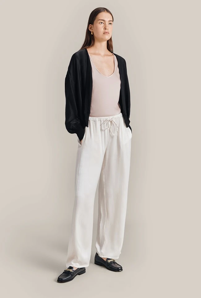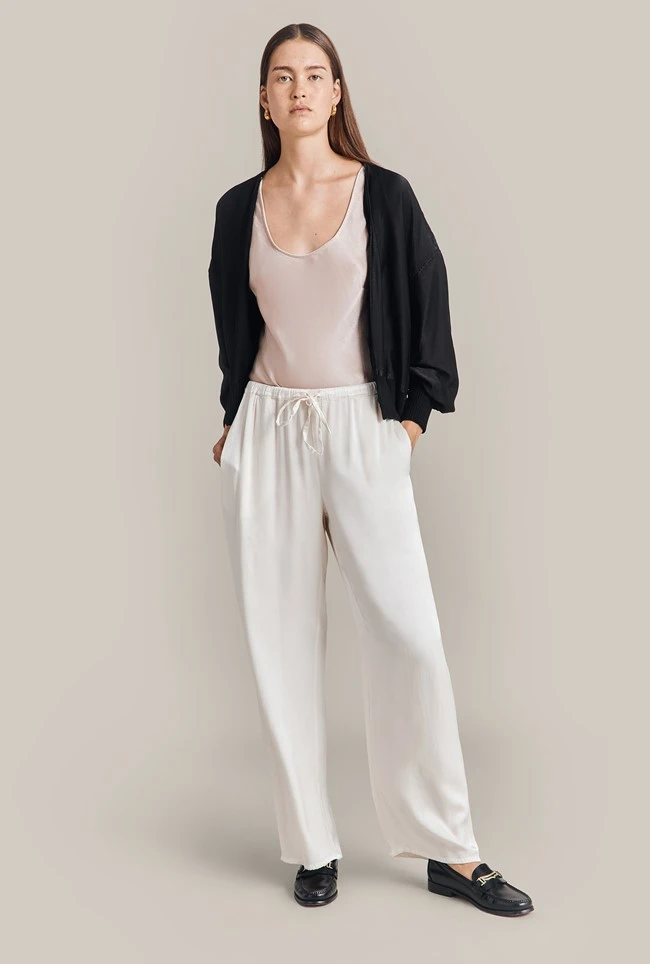 Tap into the bomber jacket trend with Anouk. Made using our sustainable Eco Vero satin, Anouk provides both comfort and style. With an open front and a deep ribbed hemline that hugs the figure and matching cuffs, Anouk will pair perfectly with trousers or jeans.
