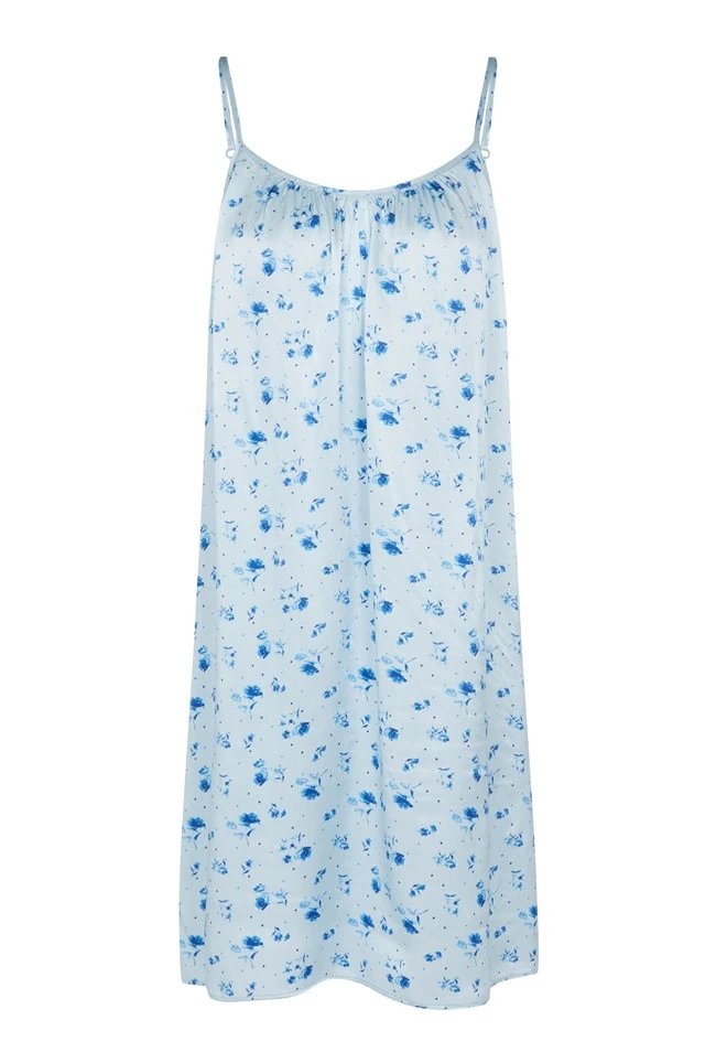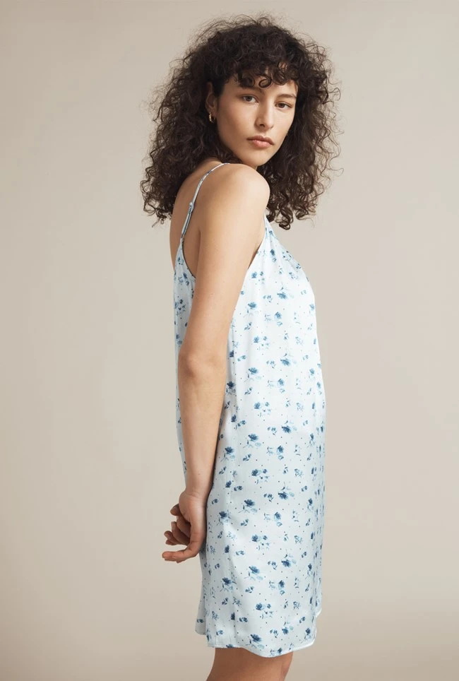 Keep your cool with our Ellen slip in gorgeous light blue rose dot floral. Made from filament satin this lightweight nightgown is designed to ensure freedom of movement and a comfortable fit. Falling above the knee and easy to wear this slip also features a flattering round neckline and delicate straps that cross over at the back for extra style. Match with some cosy slippers and our Alexa Robe for the finished night-time look.