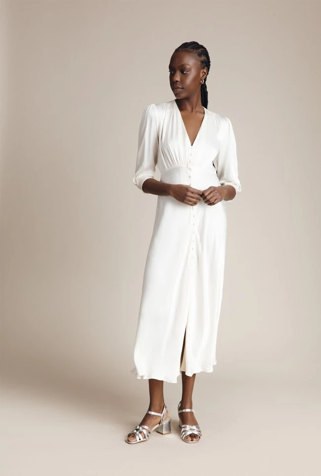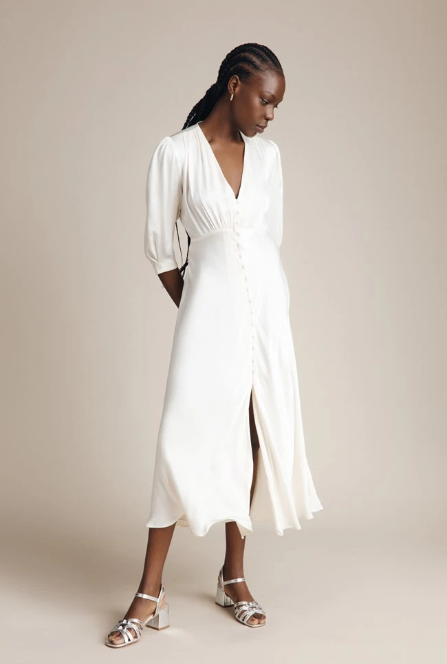 If you need a simple yet striking showstopper outfit, look no further than our Madison dress. Cut from sustainable EcoVero heavy satin, this vintage-inspired style features puffed shoulders, fabric covered buttons and three-quarter length sleeves. With a classic silhouette and front split detail, this ultra-feminine dress will endure season after season – plus it would also make the perfect bridesmaid’s dress.