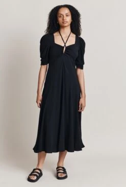 A midi-length stunner, Trixie features a deep round neckline and tie bust detail that offers a chic and sophisticated look. The empire line bust and wide straps provide both comfort and style. Made from high-quality crepe, this dress is perfect for any occasion this summer.